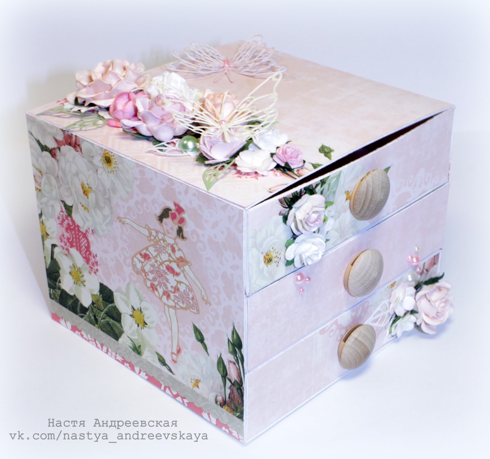 Размер комода 15*15*12. Бумага Webster's Pages. Много цветов и полюбившиеся мне воздушные бабочки (нож Memory Box)